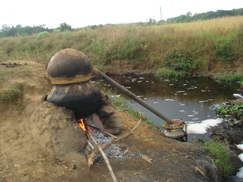 Ancient Indians designed the Mysore still which was placed over a fire ignited in a hole in the ground. [2] A liquid made from rice, molasses, and cocoa-nut tree juice was added to the still, and the whole setup was covered with earth so that heat was retained. Once the liquid boiled, steam was condensed using a stream of cool water.